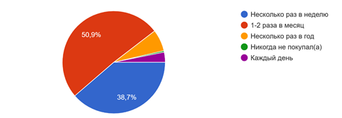 Более половины респондентов (50,9%) ответили, что совершают покупки раз в месяц, 38,7% – несколько раз в неделю, что свидетельствует о сформировавшейся потребительской привычке покупать товары на маркетплейсах.