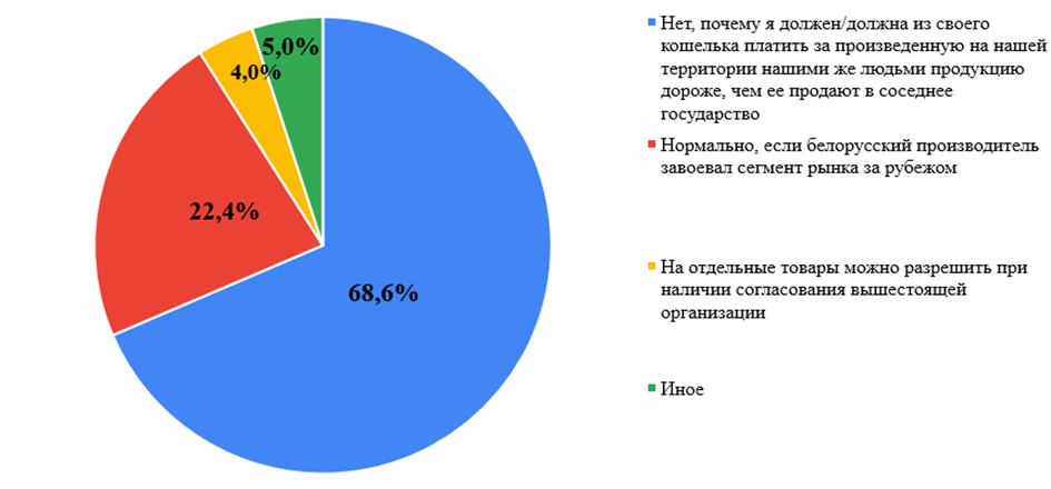 3. 68,6 % респондентов считают не нормальным, когда белорусский товар продается на экспорт по более низким ценам, чем на внутренний рынок страны, а 22,4 % считают нормальным в случае, когда белорусских производитель завоевал свою долю и сегмент за рубежом.